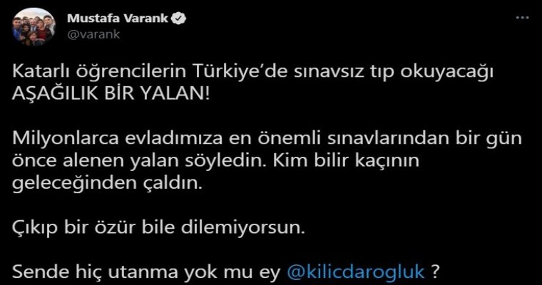 Sanayi ve Teknoloji Bakanı Mustafa Varank, Cumhuriyet Halk Partisi (CHP) Genel Başkanı Kemal Kılıçdaroğlu’nun ‘Katarlı gençler, Türkiye’de sınavsız tıp okuyabilecek’ haberini resmi Twitter hesabından paylaşması üzerine, “Katarlı öğrencilerin Türkiye’de sınavsız tıp okuyacağı aşağılık bir yalan. Sende hiç utanma yok mu ey Kılıçdaroğlu?” ifadelerini kullandı.