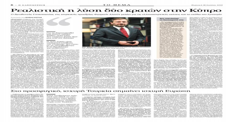Cumhurbaşkanlığı İletişim Başkanı Fahrettin Altun, Yunan Kathimerini gazetesine verdiği mülakatta Türk-Yunan ilişkileri, Kıbrıs meselesi, Doğu Akdeniz ve sığınmacı krizi gibi konulara ilişkin değerlendirmelerde bulundu. Türkiye’nin kendisini ilgilendiren her bölgede sorunların diyalog yoluyla çözülmesini ve barışın hakim olmasını istediğinin altını çizen Altun, "Bu durum, Kıbrıs meselesi için de geçerlidir. Kıbrıslı Türkler, geçmişte yaşanan şiddet olaylarını sineye çekerek, on yıllardır Rumların makul davranmasını bekledi" şeklinde konuştu.