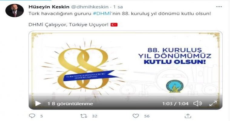 DHMİ Genel Müdürlüğü, kuruluşunun 88’inci yılını kutluyor. Kuruluş yıl dönümü münasebetiyle bir mesaj yayımlayan DHMİ Yönetim Kurulu Başkanı ve Genel Müdürü Hüseyin Keskin, elde edilen başarılara dikkat çekerek, geleceğe ilişkin kurumun hedeflerini paylaştı.