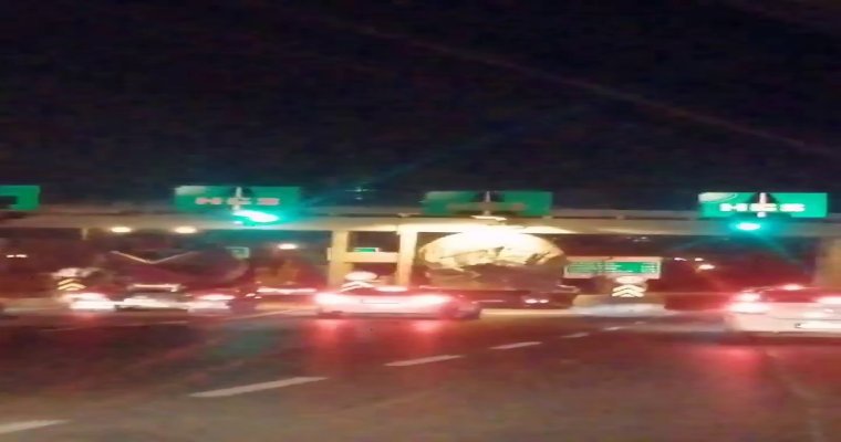 TEM Otoyolu Hadımköy gişelerinden geçmek isteyen malzeme yüklü kamyon, gişelerin tavanına çarptı. Kamyondan sökülen parça gişede asılı kalırken, o anlar bir vatandaşın cep telefonu kamerasına yansıdı.