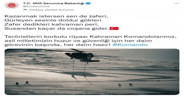 Milli Savunma Bakanlığı’na ait sosyal medya hesaplarından komandoların nefes kesen görevlerinden görüntüler paylaşıldı. Paylaşılan video klip, “Teröristlerin korkulu rüyası Kahraman Komandolarımız, asil milletimizin huzur ve güvenliği için her daim görevinin başında, her daim hazır” notuyla yayımlandı.