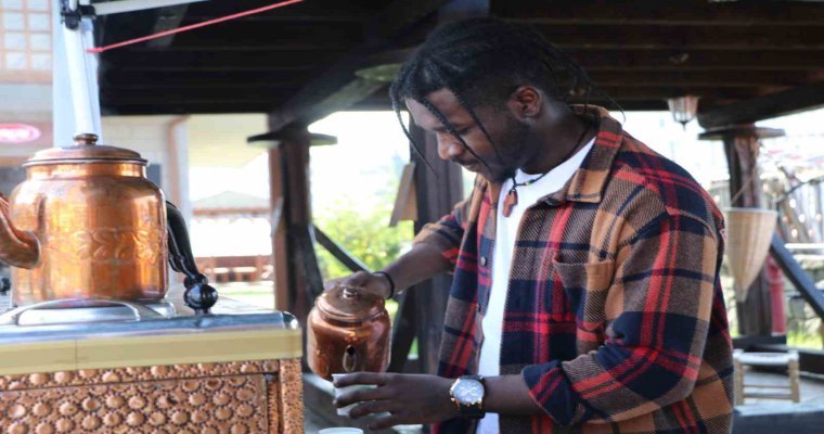 Rize’de sosyal medya yoluyla ünlenen Ganalı Üniversite öğrencisi Cumhuriyetin 100. yılına özel 100 bin bardak çay dağıtımı etkinliğine katılarak çay dağıttı.