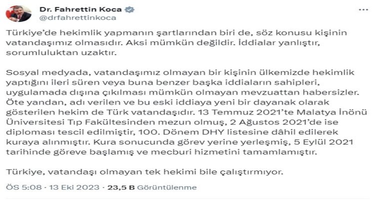 Sağlık Bakanı Fahrettin Koca, sosyal medya hesabından yaptığı açıklamada, ülkede hekimlik yapanların Türkiye vatandaşı olması gerektiğine vurgu yaptı. Yabancı uyruklu bir kişinin hekimlik yaptığı iddialarının dayanıksız olduğunu belirten Bakan Koca, “Adı verilen ve bu eski iddiaya yeni bir dayanak olarak gösterilen hekim de Türk vatandaşıdır. 13 Temmuz 2021’te Malatya İnönü Üniversitesi Tıp Fakültesinden mezun olmuş, 2 Ağustos 2021’de ise diploması tescil edilmiştir. 100. dönem DHY listesine dahil edilerek kuraya alınmıştır. Kura sonucunda görev yerine yerleşmiş, 5 Eylül 2021 tarihinde göreve başlamış ve mecburi hizmetini tamamlamıştır. Türkiye, vatandaşı olmayan tek hekimi bile çalıştırmıyor” ifadelerine yer verdi.
