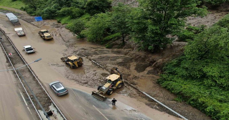 Doğu Karadeniz Bölgesi’nde dün geceden bu yana şiddetli yağışlar etkili olmayı sürdürüyor. Yağışlar nedeniyle Trabzon-Gümüşhane karayolu üzerinde yamaçlardan gelen çok sayıda küçük dere taş, çamur ve ağaç parçalarının oluşturduğu teresubatları yola taşıdı. Bu nedenle yol bugün sabah saatlerinde Maçka ilçesi Yazılıtaş mevkii başta olmak üzere bir çok noktada ulaşıma kapandı. Yolda uzun araç kuyrukları oluşurken, Karayolları ekipleri bir çok noktada çalışma başlatırken, yola gelen teresubatları temizleyerek karayolunu tek şeritten kontrollü olarak ulaşıma açtı. Yazılıtaş mevkiinde yolun hemen üst kesiminde bulunan 2 ev sel suları ve çamur nedeniyle zarar görürken, yaşanan etkili yağışlara rağmen bir can kaybının yaşanmaması herkesi sevindirdi.